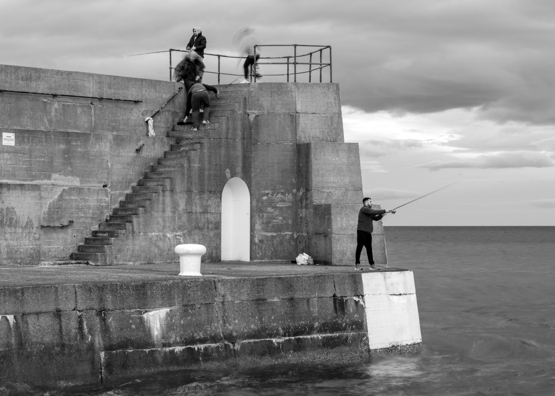 I was experimenting with street photography at the seaside, using a longer shutter speed to capture movement. While I got the movement I wanted, I was also pleased that the man on the lower level appeared sharp as he released his cast and the man fishing on the top left. The rest of the people are in motion, creating an interesting effect on the digital sensor. Enjoy!.