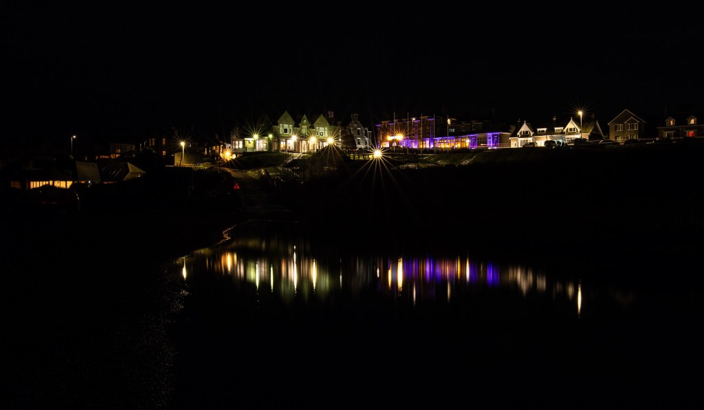 This image was taken from the Lossiemouth West Beach Carpark after rainfall, creating a puddle that reflects the lights of the Moray Golf Clubhouse and the Stotfield Hotel. It was captured with an 8-second exposure using a tripod. Unfortunately, the carpark is currently facing problems due to tidal damage and coastal erosion, which have resulted in the loss of at least 10 parking spaces. This has transformed what was once a spacious parking area into a cramped one, creating a significant repair bill. Enjoy!